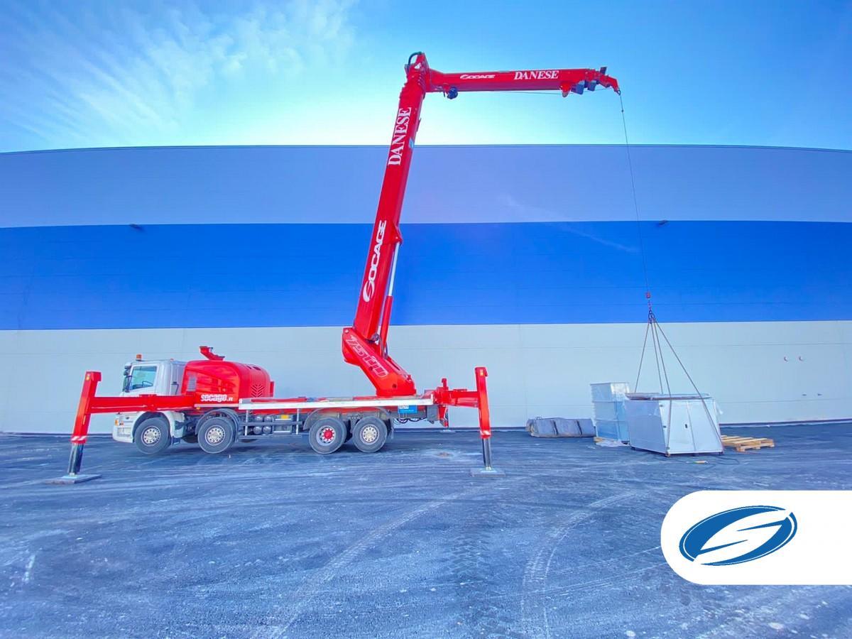 The maximum working height is 74.50 m and the maximum lateral reach is 39.5 m for vehicle bodies from 32 t. The basket load allows up to 600 kg (6 operators + equipment).