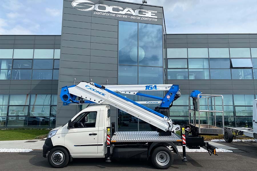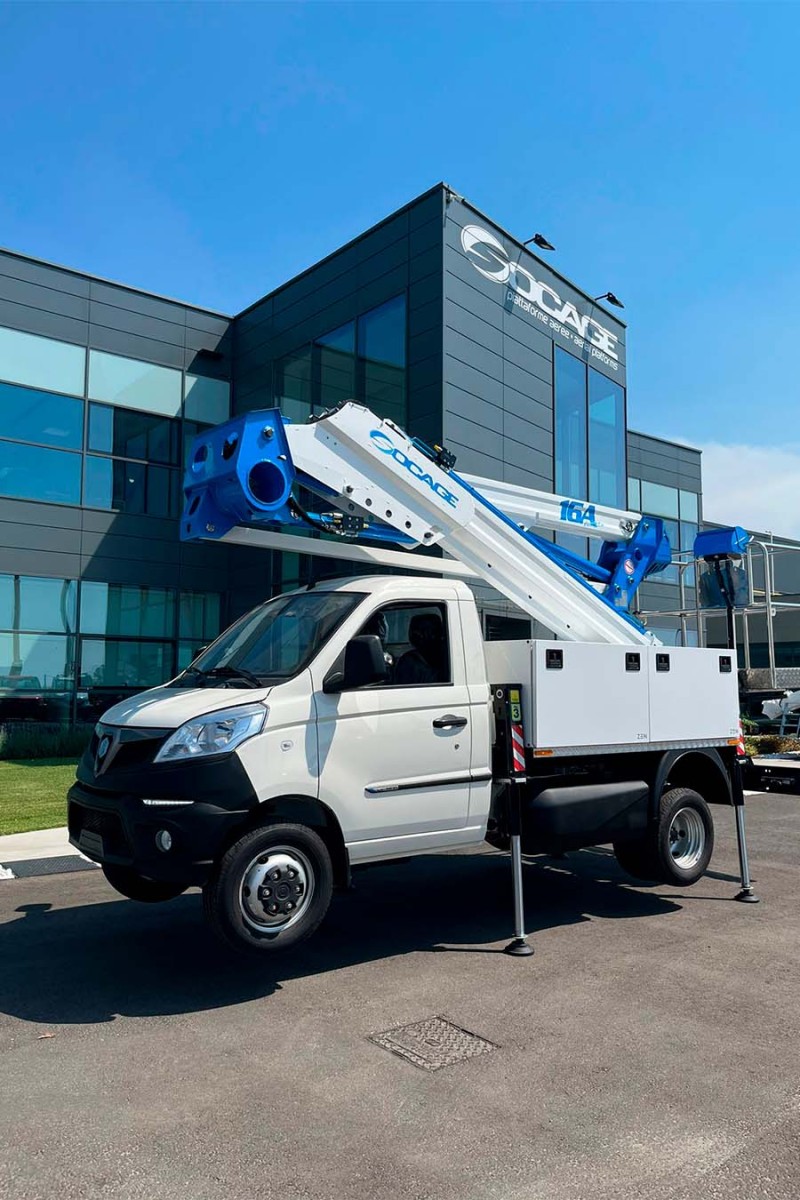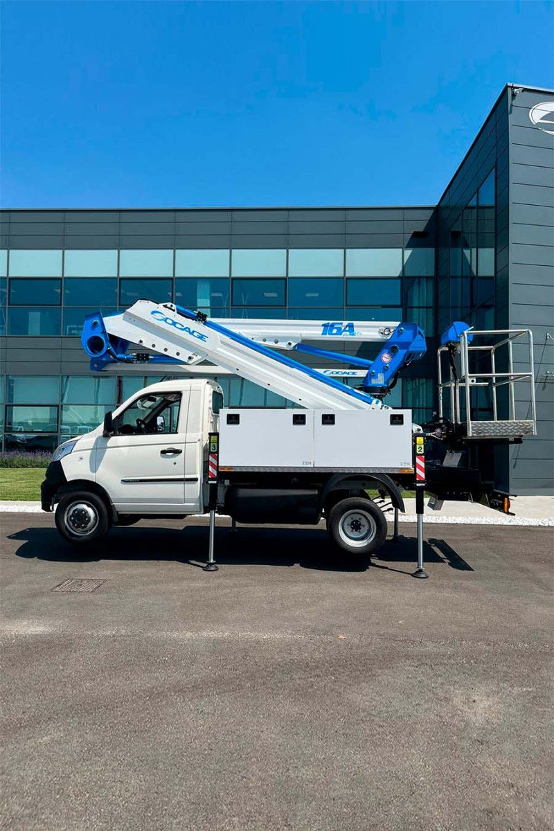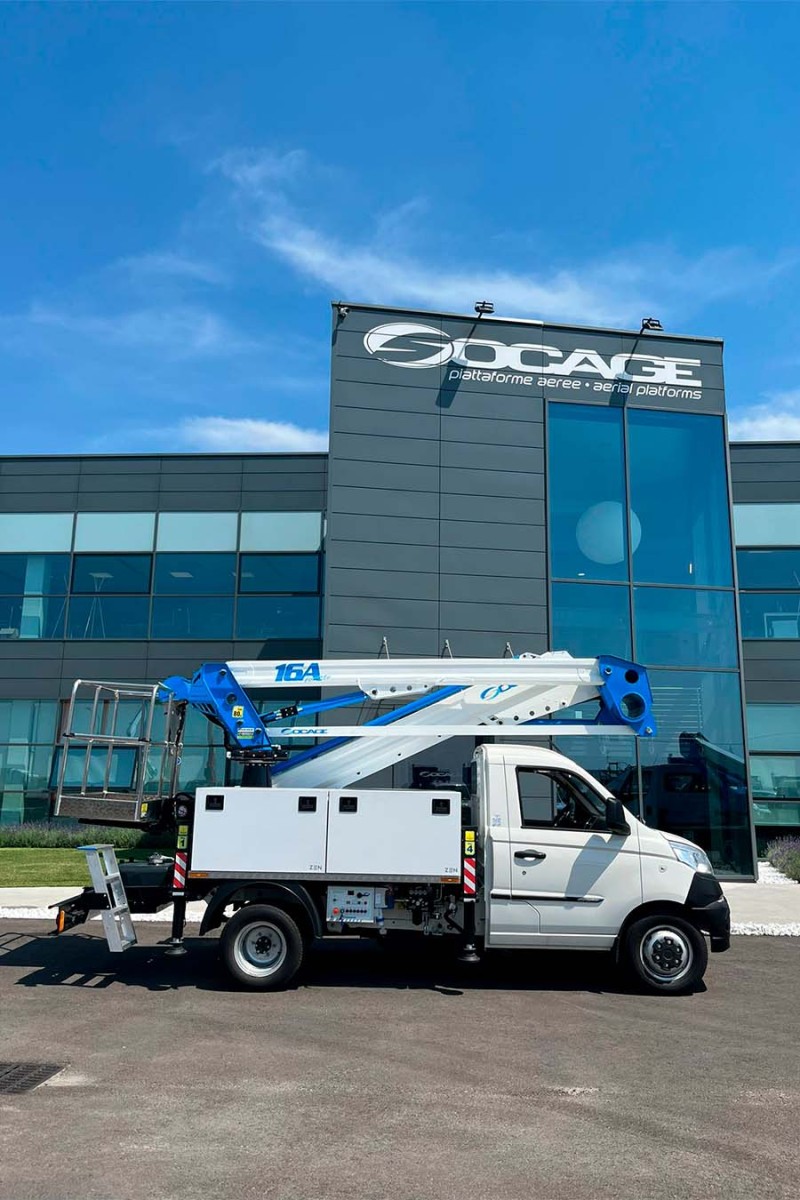 The SOCAGE truck-mounted aerial platform forSte 16A SPEED is a truck-mounted articulated telescopic aerial platform that is mounted on vehicles with a chassis weight of less than 3500 kg. It is ideal for compact mounting on short-wheelbase vehicles and achieves a working height of 15.9 m and a lateral outreach of 7.5 or 9.6 m with a basket capacity of 230 kg. (2 operators + material). The basket rotation is 90º left + 90º right.