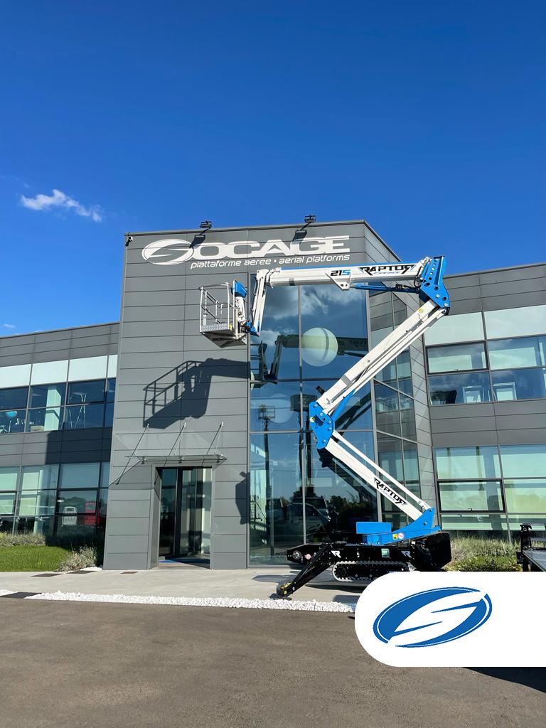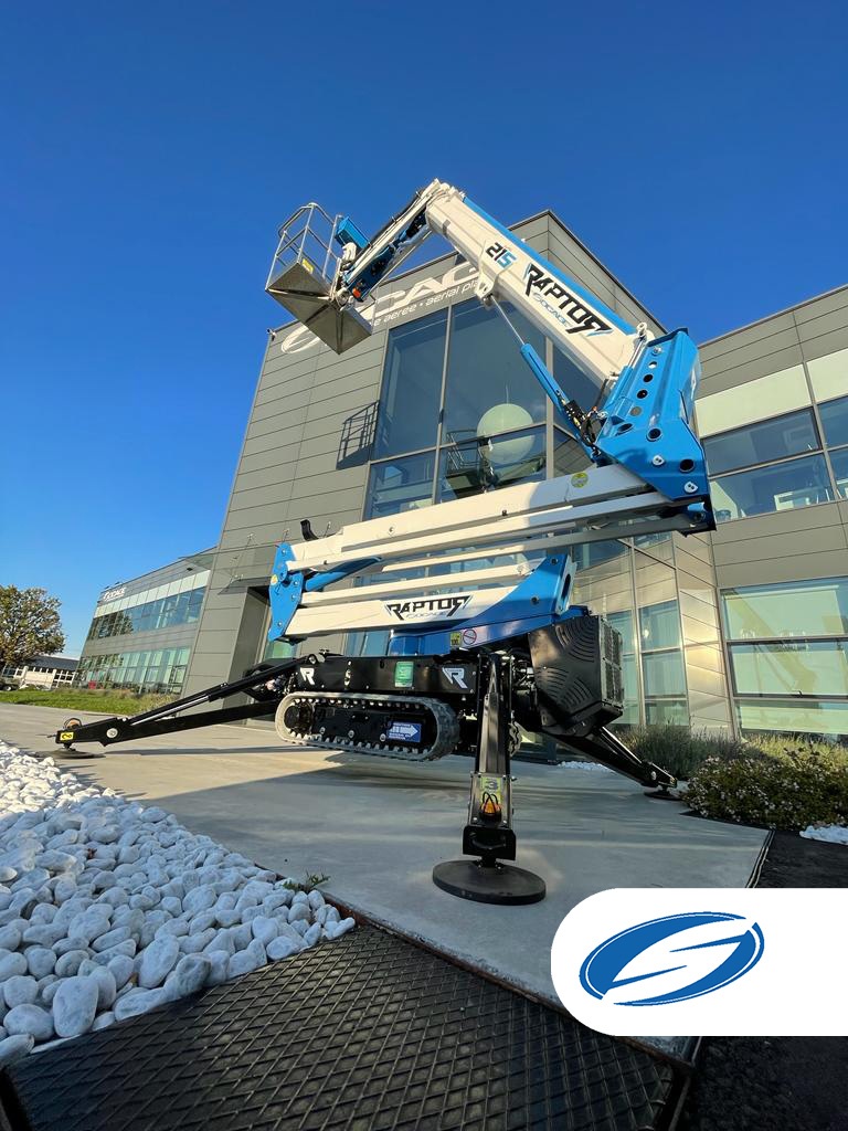 The RAPTOR 21S tracked aerial platform is a crawler-mounted aerial platform with a maximum working height of 20.80 m and a maximum lateral reach of 11.30 m. Its basket load capacity is 230 kg (2 operators + material) throughout the entire working range without any restrictions. It is equipped with automatic stabilization and automatic closing (HOME function).