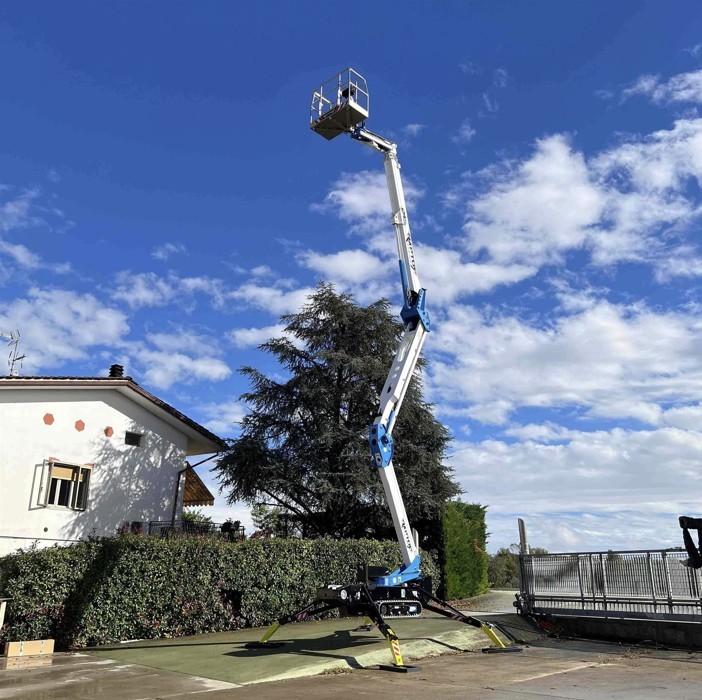 It achieves a maximum working height of 23.80 m and a maximum lateral outreach of 11 m with a load capacity of 230 kg (2 operators + material). The 380° turret rotation, articulated jib, and double articulated boom enable optimal maneuverability.